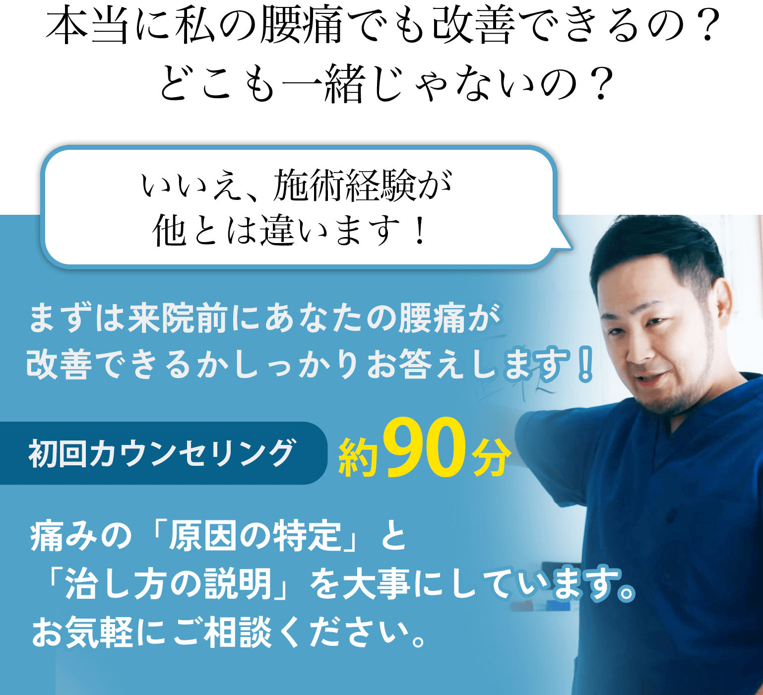 当院では痛みが出ている部分だけを見るのではなく、腰に負担がかかっている原因を初回のカウンセリングで徹底的に確認し、痛みの根本的に改善を提供します。