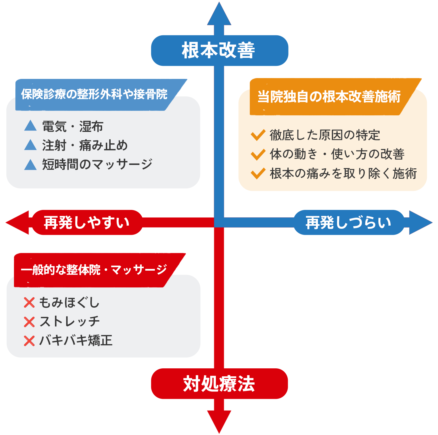 | 当院の根本改善 | 一般的な整体院 | 病院の診察・リハビリ | |